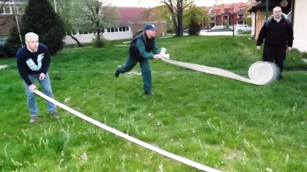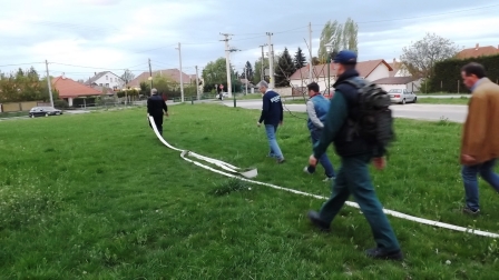 A különböző típusú tömlők kigurítása és összetekerése azonban nem volt olyan egyszerű, mint azt elsőre gondoltuk volna. Parancsnok úr többször is megmutatta, hogyan kell a tömlőket megfogni, hogy azok egyenesen guruljanak. A sikertelen próbálkozásokat nagy derültség követte a többiek részéről, de nem adtuk fel, bár volt aki csak „kanyartömlőt” tudott kifektetni. Ezt követően a csoport tagjai egy-egy számot kaptak 1-től 4-ig, a feladatok elosztása és a folyamatos utasítások e számok szerint hangzottak el. Munka közben számos szabályra kellet figyelnünk. A lefektetett tömlőnek a víz iránya szerinti jobb oldalán haladhatunk előre, baloldalt visszafelé, hogy a „tűzoltók” össze ne ütközzenek, miközben a megfelelő szerelékekért igyekeznek a kocsihoz.